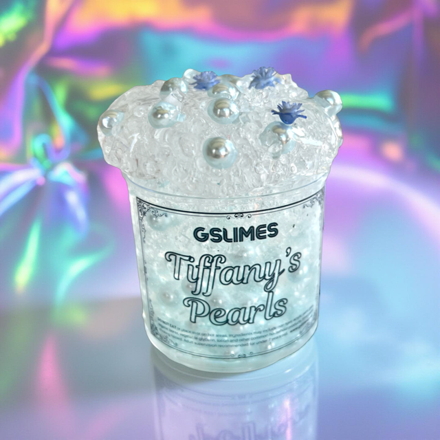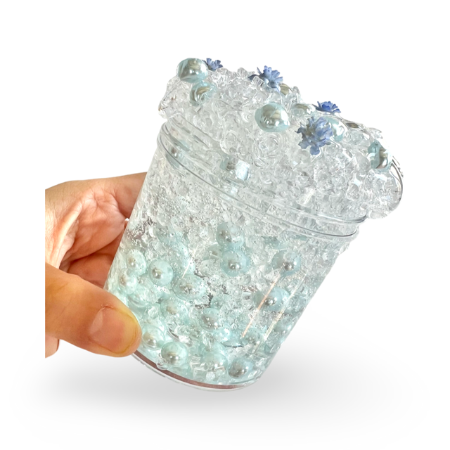 This Tiffany color-inspired slime is filled with pearls and blue flowers! This slime inflates and is medium thick with nice bubble pops.