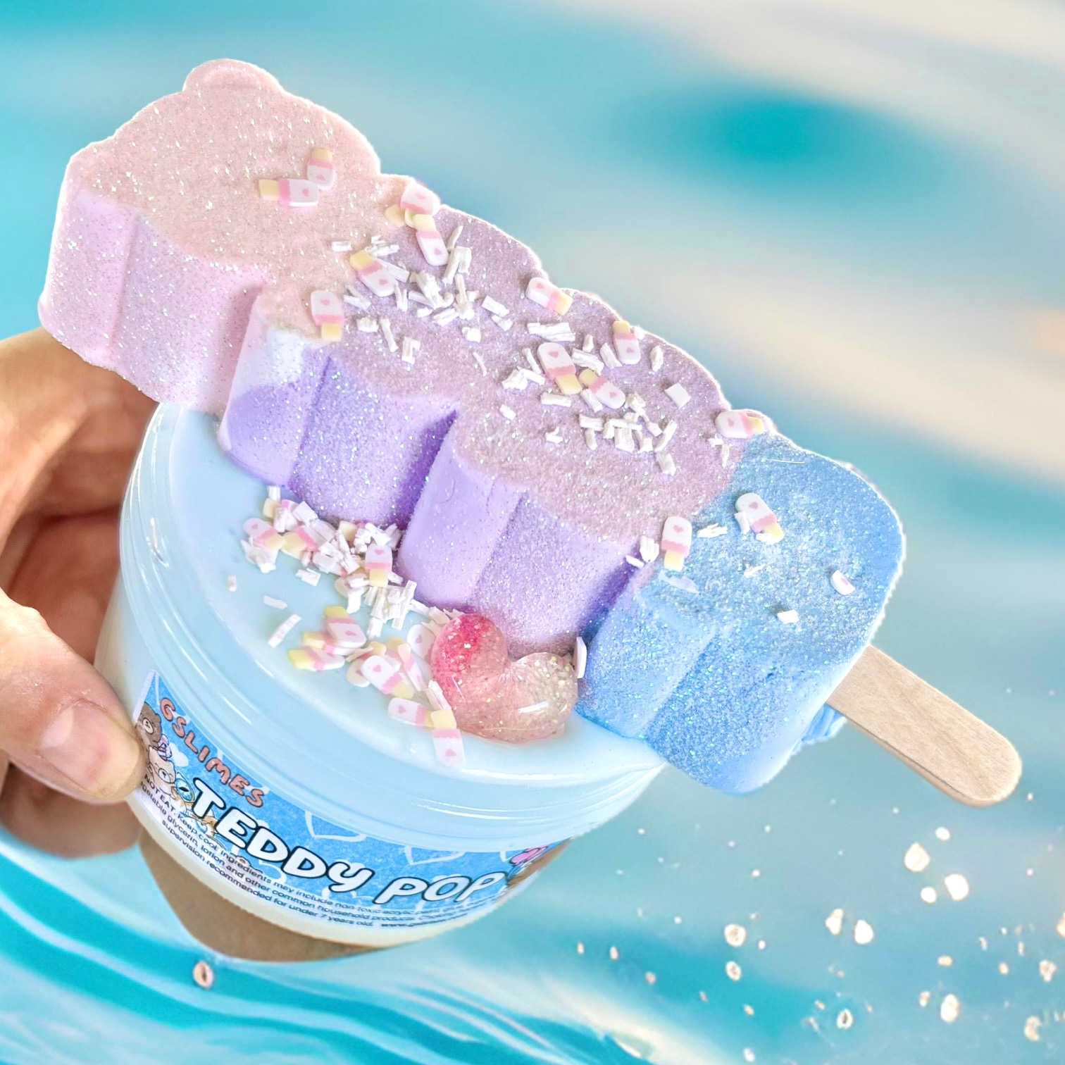 Teddy Pop features a fun bear head shape clay DIY popsicle, sprinkles and a random color heart charm. The base slime opaque soft blue. This slime inflate and becomes fluffy with a subtle sizzling sound.