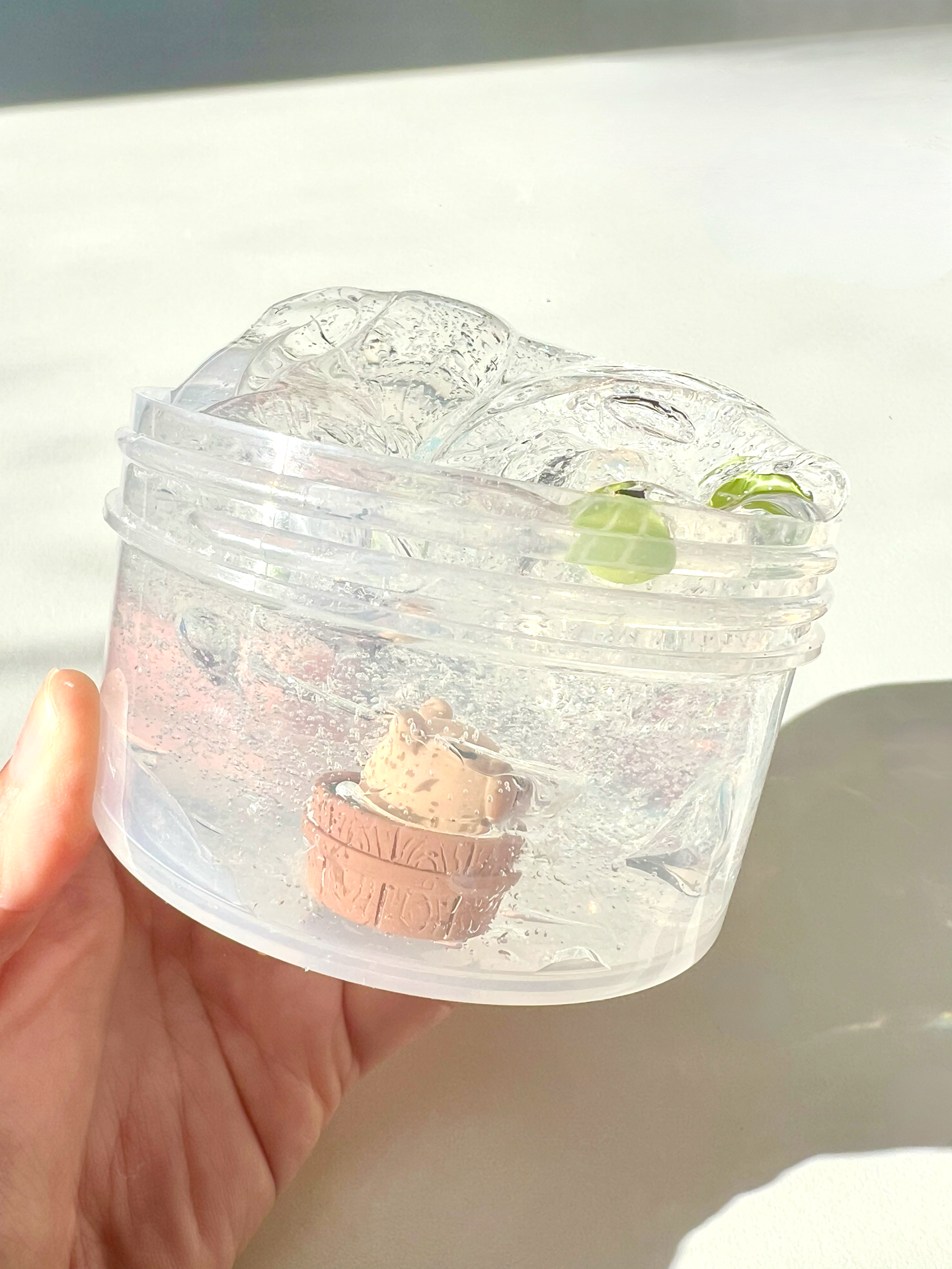 Capybara Onsen is a medium thick clear slime comes leaf sprinkles and 1 of 4 random capybara charms. Collect all four!